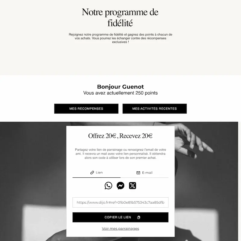 The referral scheme rounds out the programme: give €20, receive €20, naturally activating word-of-mouth around the brand.